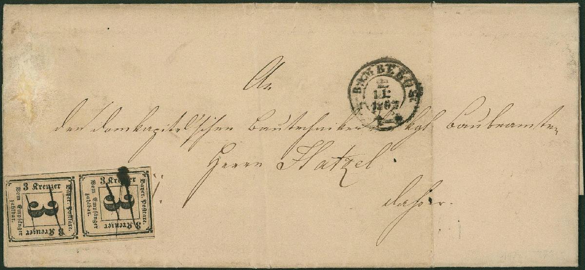 | Zusatzinformationen und Suchstichworte: | Hettinger 62. Auktion 15. Juni 2023 Los 389 Altdeutschland Bayern Wappen, 3 Kr Ziffer schwarz, senkrechtes Paar voll-/breitrandig, Federzug und nebenges. Bamberg ...1863, als portoger. MeF auf Brief, Umschlag mit kl. hinterklebter Fehlstelle, ansonsten fehlerfreie Erhaltung, entspr. FA Stegmüller 09/18, selten Ausruf 750,00 EUR |