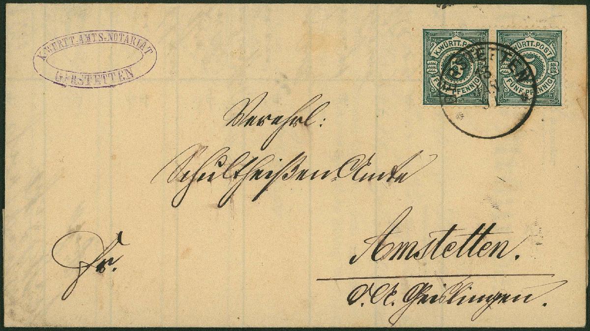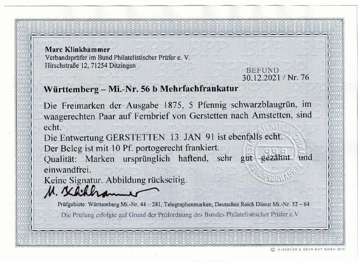 | Zusatzinformationen und Suchstichworte: | Hettinger 62. Auktion 15. Juni 2023 Los 553 Altdeutschland Württemberg 5 Pf., Ziffer, dkl'blaugrün, waag. Paar, MeF a. Brief nach Amstetten, Befund Klinkhammer 12/21 „....echt und einwandfrei Ausruf 70,00 EUR |