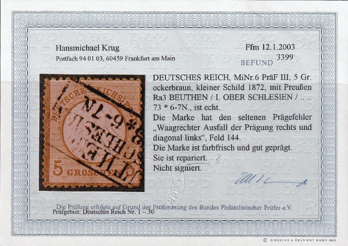 | Prüfgebiet: | Deutsches Reich 1871 - 1918 (Mi-Nr. 1 - 106) |