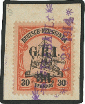 | Zusatzinformationen und Suchstichworte: | 252. Abacus Auktion 28. - 30. Juni 2023 Los 1065 Deutsche Kolonien Neuguinea Britische Besetzung 1914-15 6mm Spacing on German New Guinea '3d.' on 30pf black & orange/buff SG 8 [Stg 1; Pos 9], well centred, tied to small piece by Rabaul linotype cancel of 'Oct 22 1914' in violet, Cat £500 Ausruf 340,00 AUD |