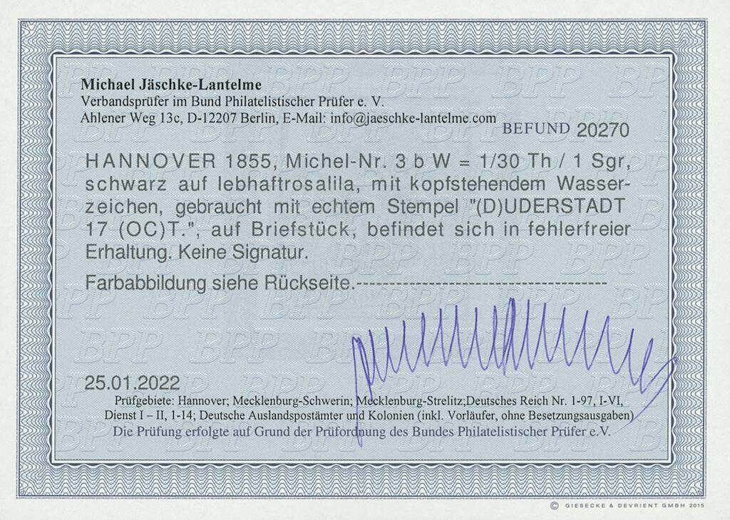| Prüfer: | Jäschke-Lantelme, Michael (BPP (Bund Philatelistischer Prüfer)) |