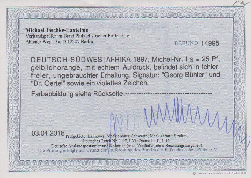| Zusatzinformationen und Suchstichworte: | Rauhut & Kruschel - 219. Auktion 29. Juli 2023 Los 3284 Deutsche Kolonien Südwestafrika, Vorläufer Unverausgabte 25 Pfg. gelblichorange ungebraucht, Fotoexp. Jäschke-L. "in fehlerfreier, ungebrauchter Erhaltung". Mi. 280,- Ausruf 60,00 EUR |