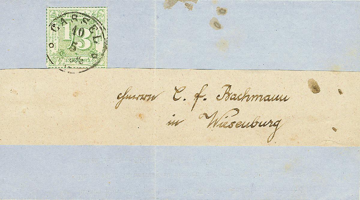 | Zusatzinformationen und Suchstichworte: | Dr. Derichs 170. Auktion 3. Juni 2023 Los 1502 Altdeutschland Thurn und Taxis 1/3 Sgr. grün "farbig durchstochen", Einzelfrankatur auf Drucksache (Adreßschleife nachempfunden) mit K1 "Cassel 10/5" (1867). Die rechte untere Markenecke wurde ergänzt. Insgesamt ein dekorativer Beleg dieser auf Ganzstück sehr seltenen Marke Zuschlag 380,00 EUR |