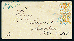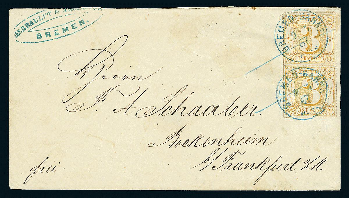 | Zusatzinformationen und Suchstichworte: | Dr. Derichs 170. Auktion 3. Juni 2023 Los 1513 Altdeutschland Thurn und Taxis 3 Sgr. ockerbraun "farbig durchstochen", senkrechtes Paar auf Kabinettbrief mit zwei blauen preußischen K1 "Bremen-Bahnf. 9.5.67" und zusätzlichen Tintenstrichen nach Bockenheim bei Frankfurt/Main. Tarifrichtige 6-Silbergroschen-Frankatur für einen Postvereinsbrief der zweiten Gewichtsstufe mit einer Entfernung von über 20 Meilen. Neues Fotoattest Sem BPP: "einwandfrei erhalten... Relativ seltene Mehrfachfrankatur dieser Marke mit Fremdentwertung durch Einkreiser des preußischen Bahnhofspostamtes.". (Michel 1.000.-+) Zuschlag 800,00 EUR |