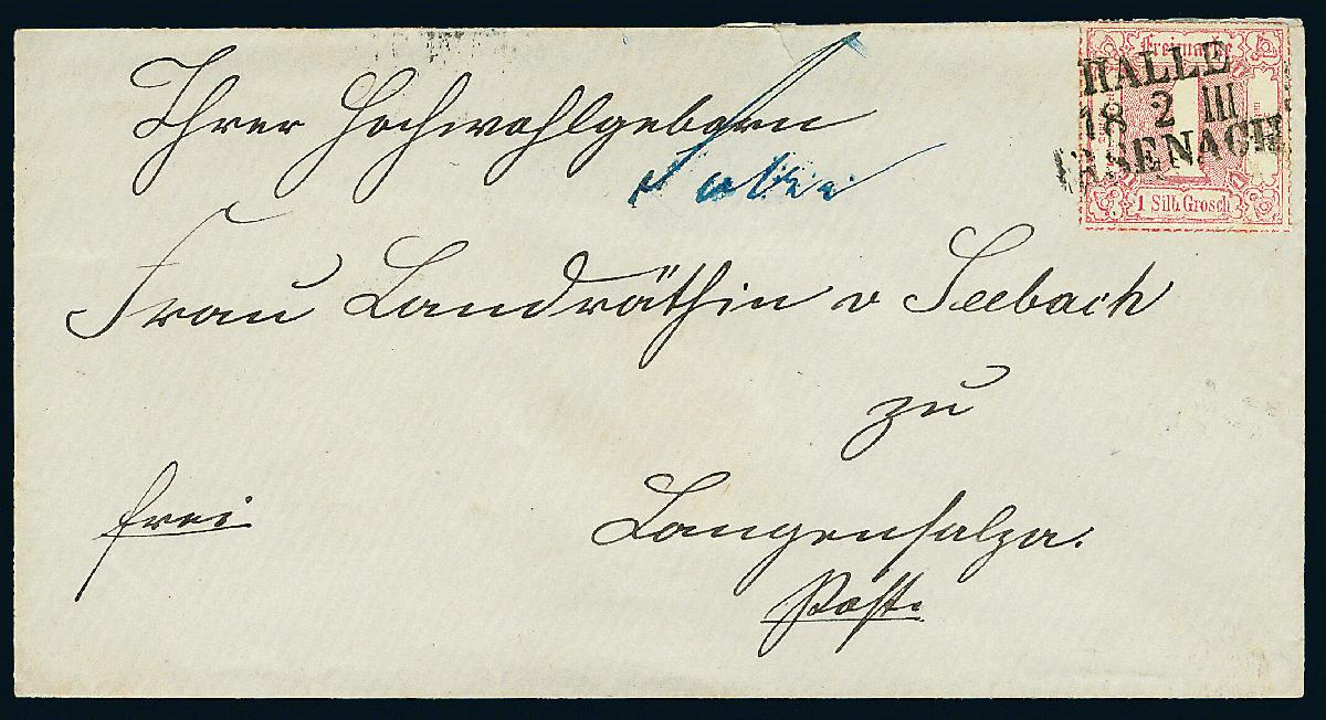 | Zusatzinformationen und Suchstichworte: | Dr. Derichs 170. Auktion 3. Juni 2023 Los 1516 Altdeutschland Thurn und Taxis 1 Sgr. karminrosa "farbig durchstochen", Einzelfrankatur auf Brief mit preußischem Bahnpost-Dreizeiler "Halle/Eisenach 18/2 III" als Entwerter und handschriftlichem Aufgabevermerk "Sulza" nach Langensalza/Königreich Preußen. Luxus. Neuer Fotobefund Sem BPP: "einwandfrei erhalten... Aktenfrischer Brief mit klarem Fremdstempel." Zuschlag 140,00 EUR |