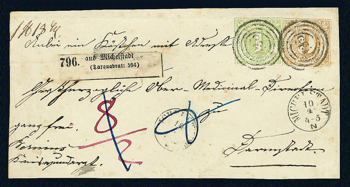 | Zusatzinformationen und Suchstichworte: | Dr. Derichs 170. Auktion 3. Juni 2023 Los 1518 Altdeutschland Thurn und Taxis 1 Kr. grün und 9 Kr. ockerbraun, beide "farbig durchstochen" auf Vorderseite eines Paket-Begleitbriefes "Anbei ein Kistchen mit Muster", gestempelt mit zweimal aufgesetztem Nummernstempel "135" und mit Neben-K2 "Michelstadt 10/4" (1867) nach Darmstadt. Kabinett. Mit gedrucktem Taxquadrat-Paketzettel "796. aus Michelstadt (Taxqudrat: 594)". Tarifrichtige 10-Kreuzer-Frankatur einschließlich Zustellgebühr. Neues Fotoattest Sem BPP: "einwandfrei erhalten... Die Marken-Frankatur auf Begleitbriefen war erst ab 1.11.1866 zugelassen. Sauberer Beleg in frischer Erhaltung." Zuschlag 360,00 EUR |