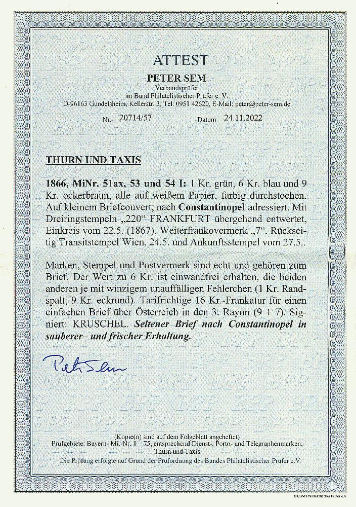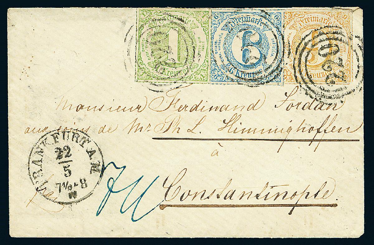 | Zusatzinformationen und Suchstichworte: | Dr. Derichs 170. Auktion 3. Juni 2023 Los 1524 Altdeutschland Thurn und Taxis \DESTINATION "TÜRKEI"\: 1 Kr. grün, 6 Kr. blau und 9 Kr. ockerbraun, alle "farbig durchstochen", auf kleinem Briefkuvert mit Nummernstempeln "220" und Aufgabe-K1 "Frankfurt a.M. 22/5" (1867) nach Constantinopel/Türkei. Die 6-Kreuzer-Marke einwandfrei, die beiden anderen mit winzigen unauffälligen Beanstandungen (1 Kr. Randspalt, 9 Kr. eckrund). Attraktive Dreifarbenfrankatur über 16 Kreuzer, tarifrichtig für einen einfachen Brief über Österreich. Neues Fotoattest Sem BPP: "Seltener Brief nach Constantinopel in sauberer und frischer Erhaltung." Zuschlag 3.200,00 EUR |