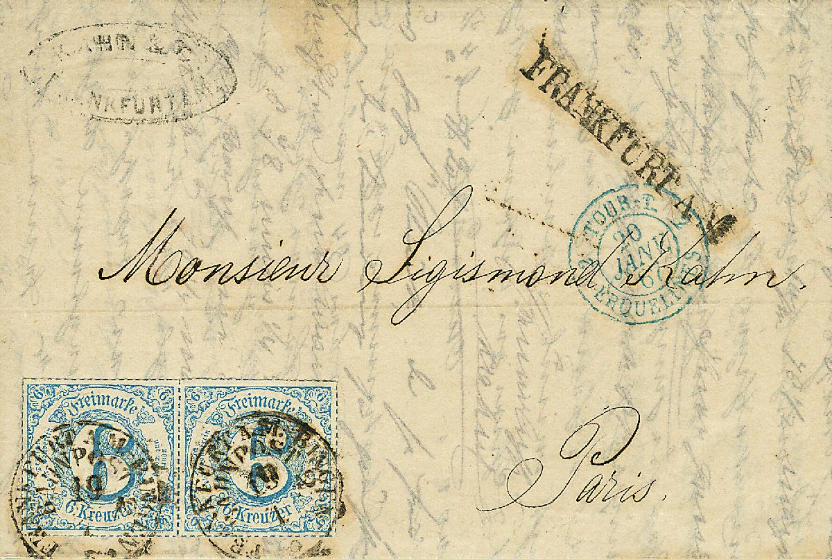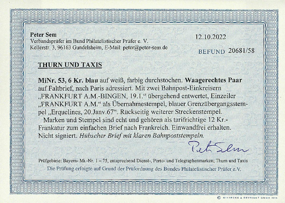 | Zusatzinformationen und Suchstichworte: | Dr. Derichs 170. Auktion 3. Juni 2023 Los 1528 Altdeutschland Thurn und Taxis 6 Kr. blau "farbig durchstochen", waagerechtes Paar auf Bahnpostbrief mit K1 "Frankfurt a.M.-Bingen 19/1" (1867) als Entwerter und mit nebengesetztem Stations-L1 "Frankfurt a.M." nach Paris mit vorderseitigem blauen französischen Grenzübergangsstempel. Luxus. Als Bahnpostbrief nach Frankreich in dieser schönen Qualität selten. Neuer Fotobefund Sem BPP: "Einwandfrei erhalten." Zuschlag 550,00 EUR |