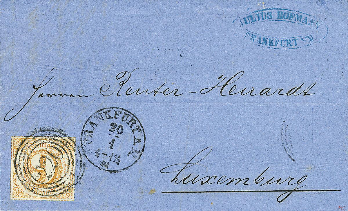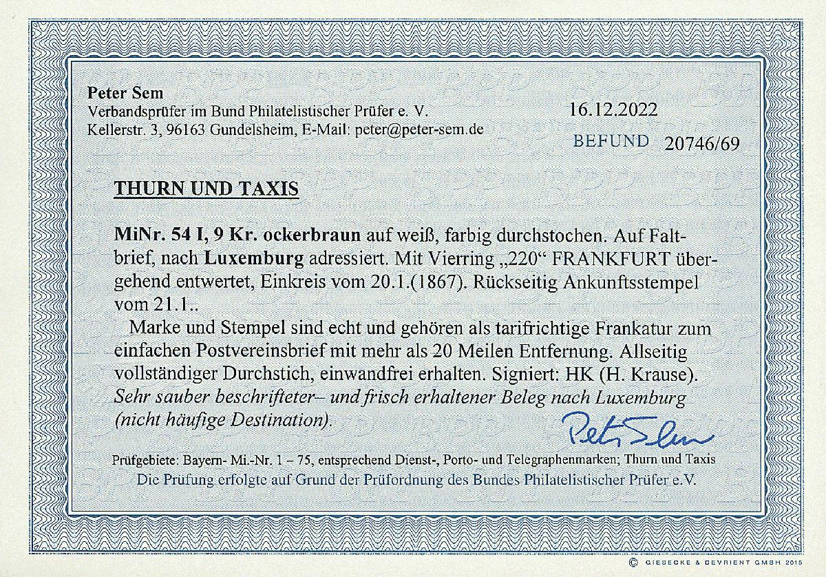 | Zusatzinformationen und Suchstichworte: | Dr. Derichs 170. Auktion 3. Juni 2023 Los 1532 Altdeutschland Thurn und Taxis \DESTINATION "LUXEMBURG"\: 9 Kr. ockerbraun "farbig durchstochen", Einzelfrankatur auf Brief mit Nummernstempel "220" und Aufgabe-K1 "Frankfurt a.M. 20/1" (1867) nach Luxemburg. Luxus. Neuer Fotobefund Sem BPP: "einwandfrei erhalten... Sehr sauber beschrifteter und frisch erhaltener Brief nach Luxemburg (nicht häufige Destination)." Zuschlag 400,00 EUR |