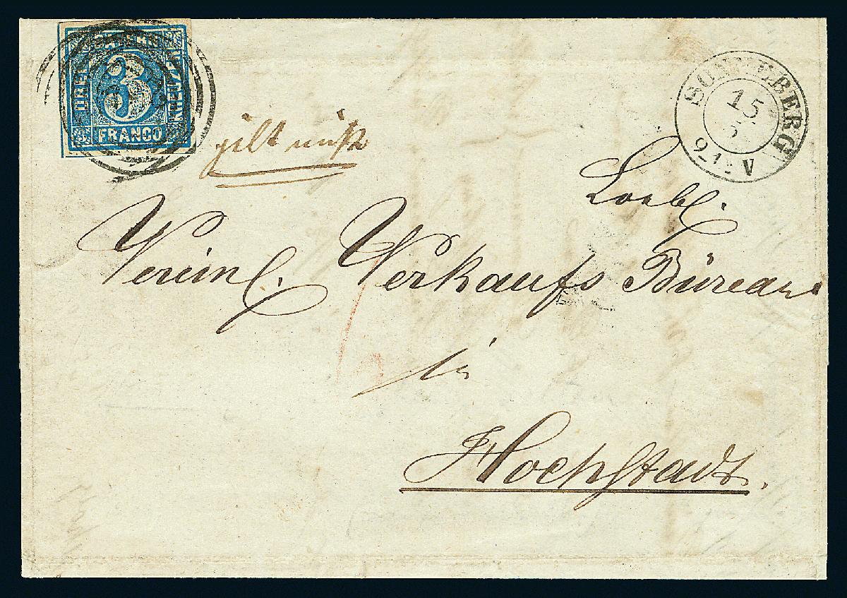 | Zusatzinformationen und Suchstichworte: | Dr. Derichs 170. Auktion 3. Juni 2023 Los 1533 Altdeutschland Thurn und Taxis Bayern 3 Kr. blau, Platte 2, voll- bis breitrandig und mit Ausnahme eines waagerechten Knitters einwandfrei auf Brief mit Fremdentwertung durch Thurn & Taxis-Nummernstempel "265" mit beigesetztem Aufgabe-K2 "Sonneberg 15/5" (1853) nach Hochstadt. Die im Taxisgebiet geklebte bayerische Marke wurde als Frankatur nicht anerkannt (handschriftlich "gilt nicht") und der Brief wurde mit 6 Kreuzer Nachtaxe belegt. Fotoattest Dr. Sommer BPP und neues Fotoattest Sem BPP: "Briefe mit bayerischer Fremdfrankatur sind von Taxis selten." Zuschlag 1.300,00 EUR |