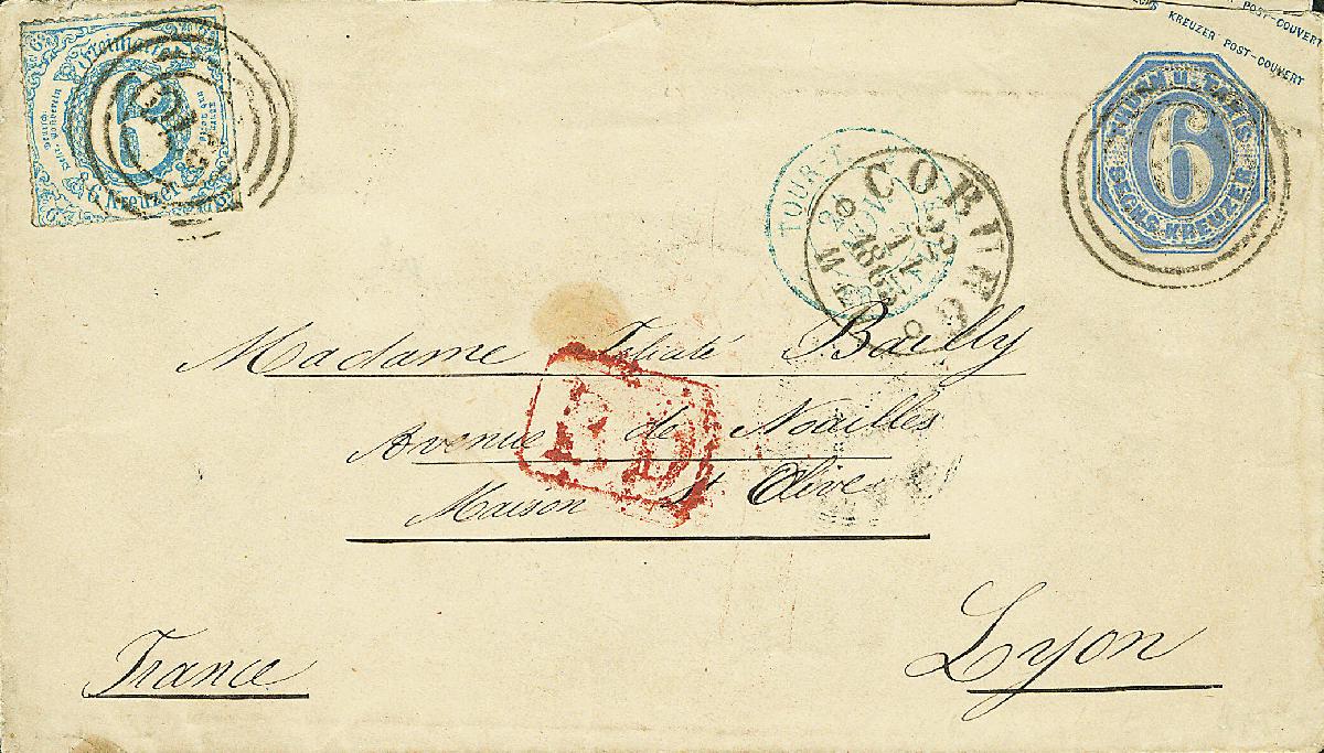 | Zusatzinformationen und Suchstichworte: | Dr. Derichs 170. Auktion 3. Juni 2023 Los 1544 Altdeutschland Thurn und Taxis Ganzsachenumschlag 6 Kr. ultramarin, Kleinformat, mit Zusatzfrankatur 6 Kr. blau "farblos durchstochen" als Auslandsbrief mit Nummernstempeln "220" und Aufgabe-K1 "Coburg 22.11.1865" nach Lyon/Frankreich, nebengesetzt roter "PD" und blauer Grenzübergangsstempel. Kabinett. Hübsche farb- und wertstufengleiche Marken/Ganzsachen-Kombination Zuschlag 100,00 EUR |