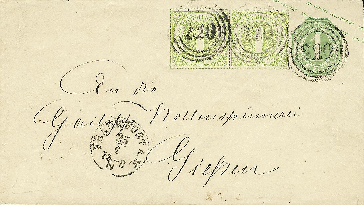 | Zusatzinformationen und Suchstichworte: | Dr. Derichs 170. Auktion 3. Juni 2023 Los 1549 Altdeutschland Thurn und Taxis Ganzsachenumschlag 1 Kr. grün, Kleinformat, mit Zusatzfrankatur von waagerechtem Paar 1 Kr. grün "farbig durchstochen" mit Nummernstempeln "220" und Neben-K1 "Frankfurt a.M. 25/1" (1867) nach Gießen. Luxus. Neuer Fotobefund Sem BPP: "einwandfrei" Zuschlag 100,00 EUR |