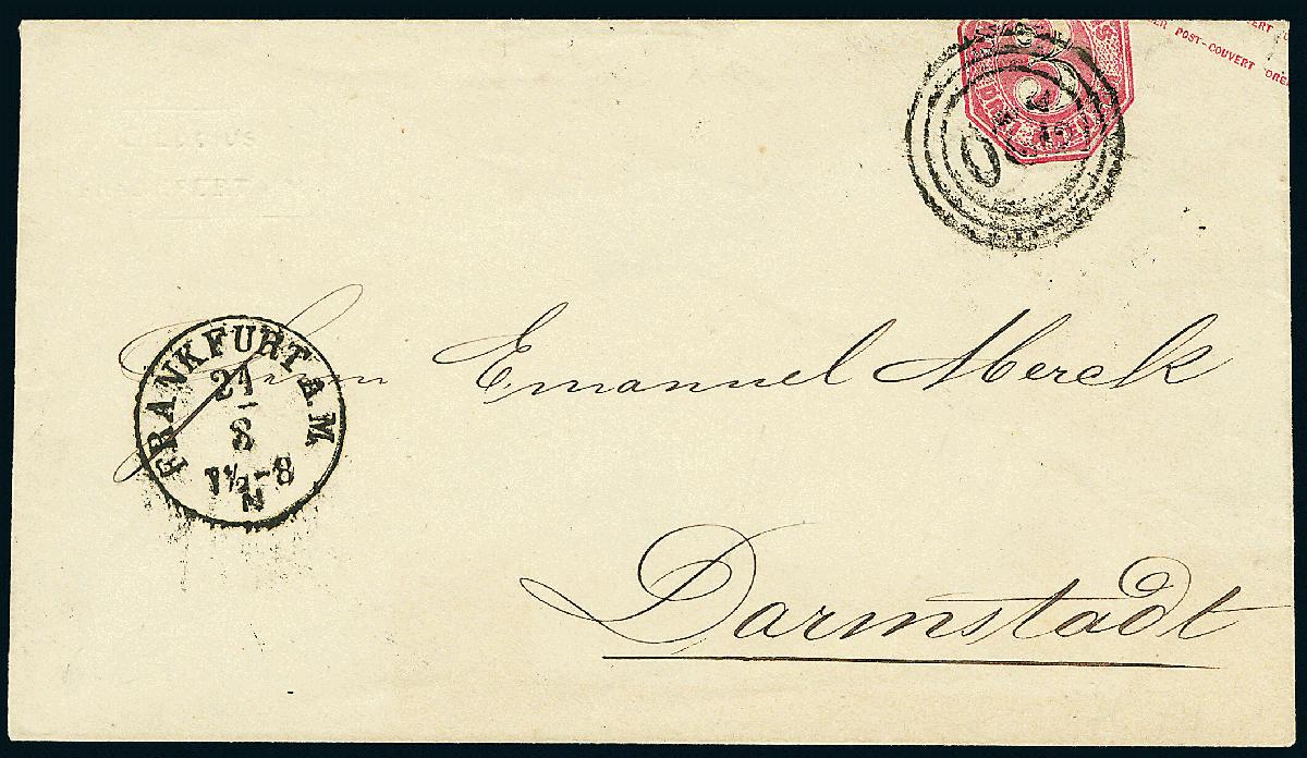 | Zusatzinformationen und Suchstichworte: | Dr. Derichs 170. Auktion 3. Juni 2023 Los 1552 Altdeutschland Thurn und Taxis Ganzsachenumschlag 3 Kr. karminrot, Kleinformat, Abart "extrem nach oben verschobener Wertstempel" (dieser deshalb teils auf der rückseitigen Verschlußklappe), mit Nummernstempel "220" und Aufgabe-K1 "Frankfurt a.M. 21/3" an Merck in Darmstadt gelaufen (heute DAX-Konzern). Luxus. In dieser Form ein äußerst seltener Umschlag. Zuschlag 100,00 EUR |