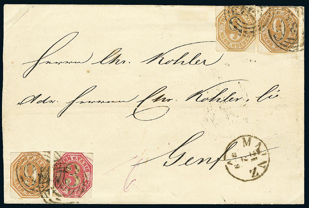 | Zusatzinformationen und Suchstichworte: | Dr. Derichs 170. Auktion 3. Juni 2023 Los 1557 Altdeutschland Thurn und Taxis Ganzsachenausschnitt 3 Kr. karminrosa zusammen mit drei Ganzsachenausschnitten 9 Kr. ockerbraun, alle viereckig geschnitten, teils gering berührt und soweit einwandfrei, auf Brief (rückseitig ohne linke Seitenklappe) mit Nummernstempeln "134" und Aufgabe-K1 "Mainz 21/2" (1865) nach Genf/Schweiz. Tarifrichtige 30-Kreuzer-Frankatur für einen Brief der 2. Gewichtsstufe in den 2. Rayon der Schweiz mit 18 Kreuzer für den Postverein und 12 Kreuzer für die Schweiz, ausgewiesen sind nur 6 Kreuzer Weiterfranko. Eine spektakuläre Frankatur-Rarität für das Sammelgebiet der Ganzsachenausschnitte. Neues Fotoattest Sem BPP: "Seltene 30 Kr.-Aufbrauchfrankatur mit Ganzsachen-Ausschnitten, die bei Taxis amtlich genehmigt war." Zuschlag 1.000,00 EUR |
