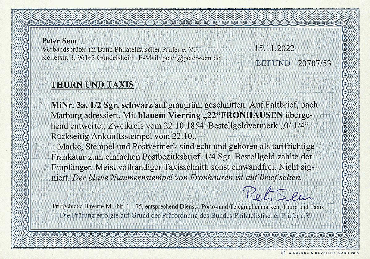 | Zusatzinformationen und Suchstichworte: | Dr. Derichs 170. Auktion 3. Juni 2023 Los 1562 Altdeutschland Thurn und Taxis "22" in BLAU und ebenfalls blauer Aufgabe-K2 "Fronhausen 22/10 1854" auf Brief mit meist vollrandiger 1/2 Sgr. schw./graugrün in Taxisschnitt nach Marburg. Neuer Fotobefund Sem BPP: "Der blaue Nummernstempel von Fronhausen ist auf Brief selten.". (Handbuch = 700.-). Zuschlag 260,00 EUR |