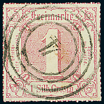 | Zusatzinformationen und Suchstichworte: | Dr. Derichs 170. Auktion 3. Juni 2023 Los 1567 Altdeutschland Thurn und Taxis "4" BARCHFELD, zentrisch und ideal klar auf Luxusstück 1 Sgr. karminrot "farbig durchstochen". Ein seltener Nummernstempel. Neuer Fotobefund Sem BPP: "einwandfrei". (Michel 70.- und Handbuch für die Abstempelung = 150.-, zusammen 220.-). Zuschlag 90,00 EUR |