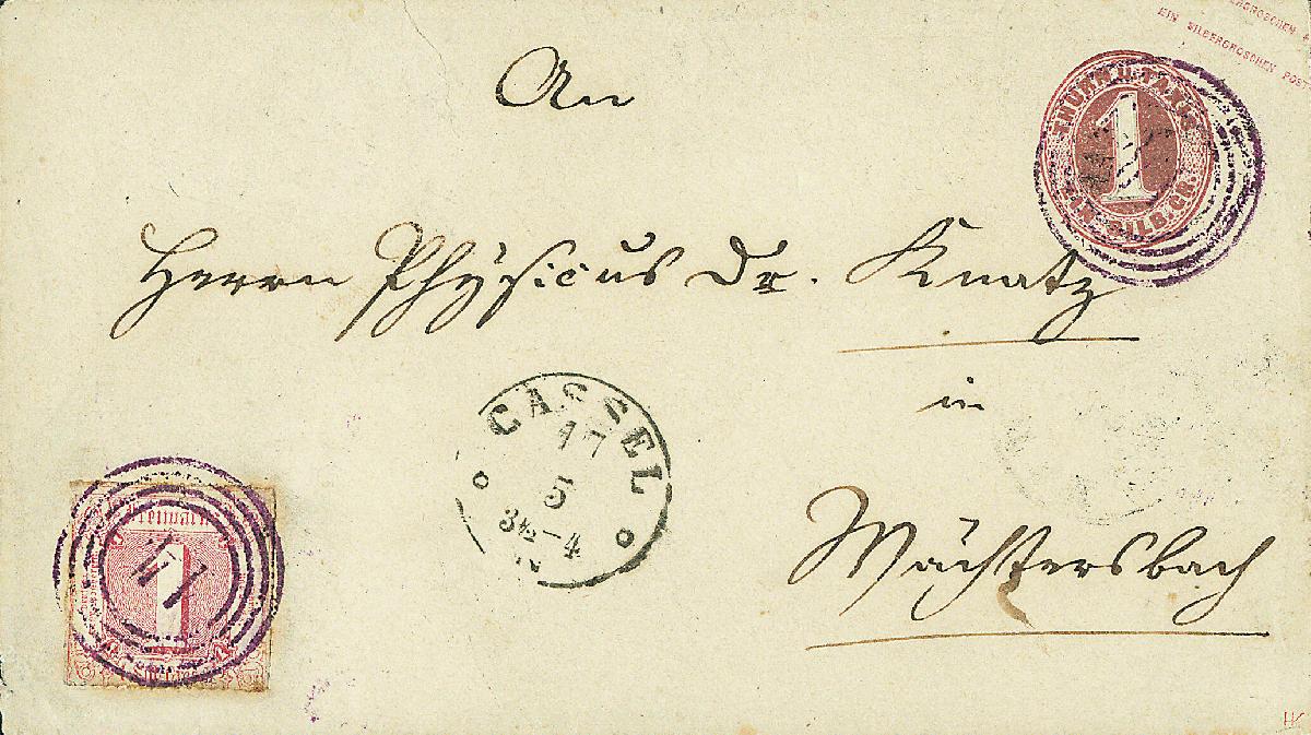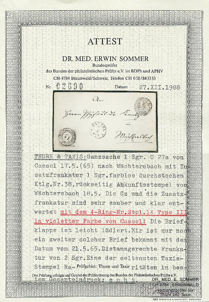 | Zusatzinformationen und Suchstichworte: | Dr. Derichs 170. Auktion 3. Juni 2023 Los 1568 Altdeutschland Thurn und Taxis "14" zweimal in VIOLETT und schwarzer Aufgabe-K1 "Cassel 17/5" auf Ganzsachenumschlag 1 Sgr. karmin mit Zusatzfrankatur 1 Sgr. karminrosa "farblos durchstochen" nach Wächtersbach (rückseitig K1 von dort). Umschlag mit üblicher leichter Beanstandung in der rückseitigen Klappe und Marke mit zarter Randpatina. Eine große Taxis-Stempelrarität. Fotoattest Dr. Sommer BPP und neues Fotoattest Sem BPP: "Der violette Nummernstempel von Cassel ist sehr selten. Es sind nur wenige Briefe bekannt.". (Handb. = 2.000.-) Zuschlag 360,00 EUR |