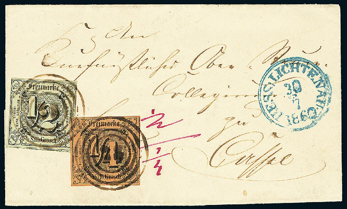 | Zusatzinformationen und Suchstichworte: | Dr. Derichs 170. Auktion 3. Juni 2023 Los 1569 Altdeutschland Thurn und Taxis "38" zweimal in BRAUNROT und blauer Aufgabe-K1 "Hess. Lichtenau 30.7.1860" auf Brief mit 1/4 Sgr. schw./braunorange und 1/2 Sgr. schw./graugrün nach Kassel. Luxus. Beide Marken sind voll- bis überrandig und zeigen an je einer Seite Teile einer Nachbarmarke. Tarifrichtige 3/4-Silbergroschen-Frankatur für einen einfachen Postbezirksbrief bis 3 Meilen Entfernung mit im voraus bezahlten Bestellgeld. Fotoattest Dr. Sommer BPP und neues Fotoattest Sem BPP: "einwandfrei erhalten... Mir sind nur wenige Briefe mit dem Nummernstempel in braunroter Farbe bekannt.". (Handbuch nur für die Abstempelung = 2.500.-). Zuschlag 450,00 EUR |