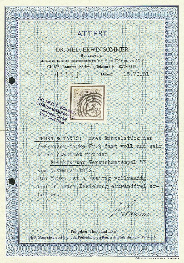 | Zusatzinformationen und Suchstichworte: | Dr. Derichs 170. Auktion 3. Juni 2023 Los 1571 Altdeutschland Thurn und Taxis \VERSUCHSSTEMPEL\: "53" FRANKFURT, vorbildlich klar auf vierseitig voll- bis überandiger 6 Kr. schw./rosa (Type "IA") mit Ansätzen der linken und oberen Nachbarmarke. Luxus. Fotoattest Dr. Sommer BPP und neuer Fotobefund Sem BPP: "einwandfrei erhalten... Der sehr klar abgeschlagene Versuchsstempel wurde nur vom 8. bis 25.11.1852 in Frankfurt verwendet.". (Handbuch = 800.-). Zuschlag 135,00 EUR |