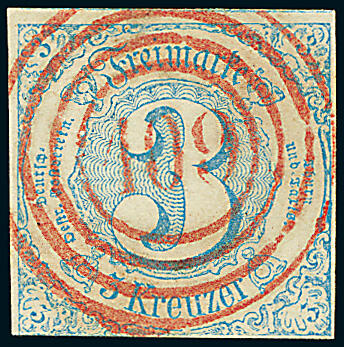 | Zusatzinformationen und Suchstichworte: | Dr. Derichs 170. Auktion 3. Juni 2023 Los 1572 Altdeutschland Thurn und Taxis "109" ERBACH in leuchtendem Rot, zentrisch, gerade und ganz klar auf 3 Kreuzer blau, diese nur links unten winzig berührt und sonst überall voll- bis breitrandig bzw. oben sogar auf voller Länge mit Ansatz der Nachbarmarke. Schöner Farbkontrast von Marke und Abstempelung. Neuer Fotobefund Sem BPP. Zuschlag 260,00 EUR |