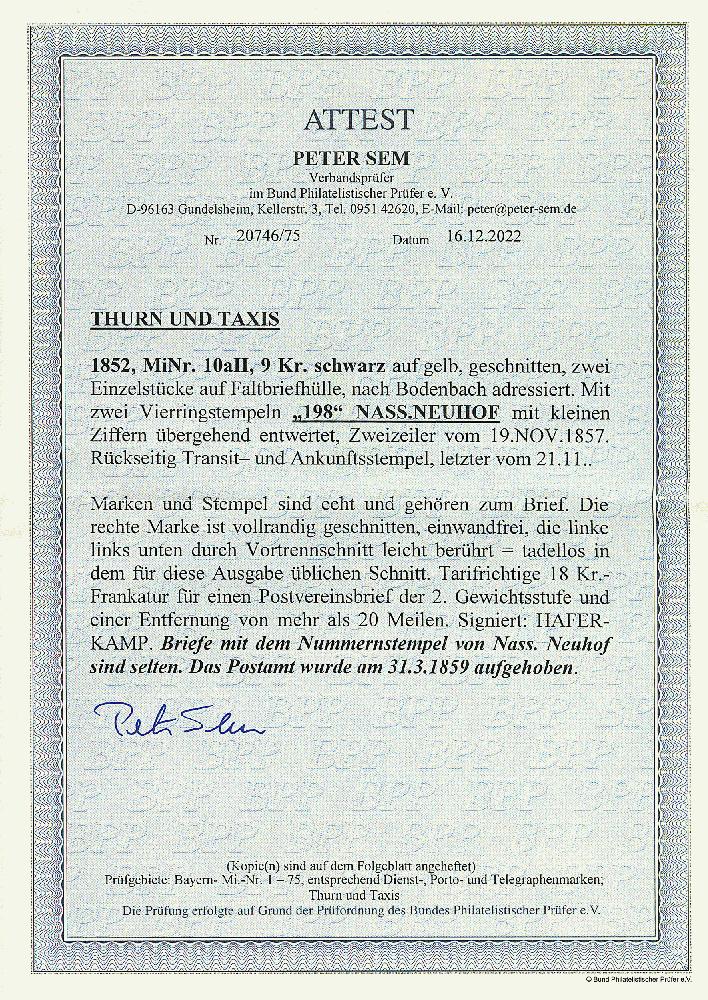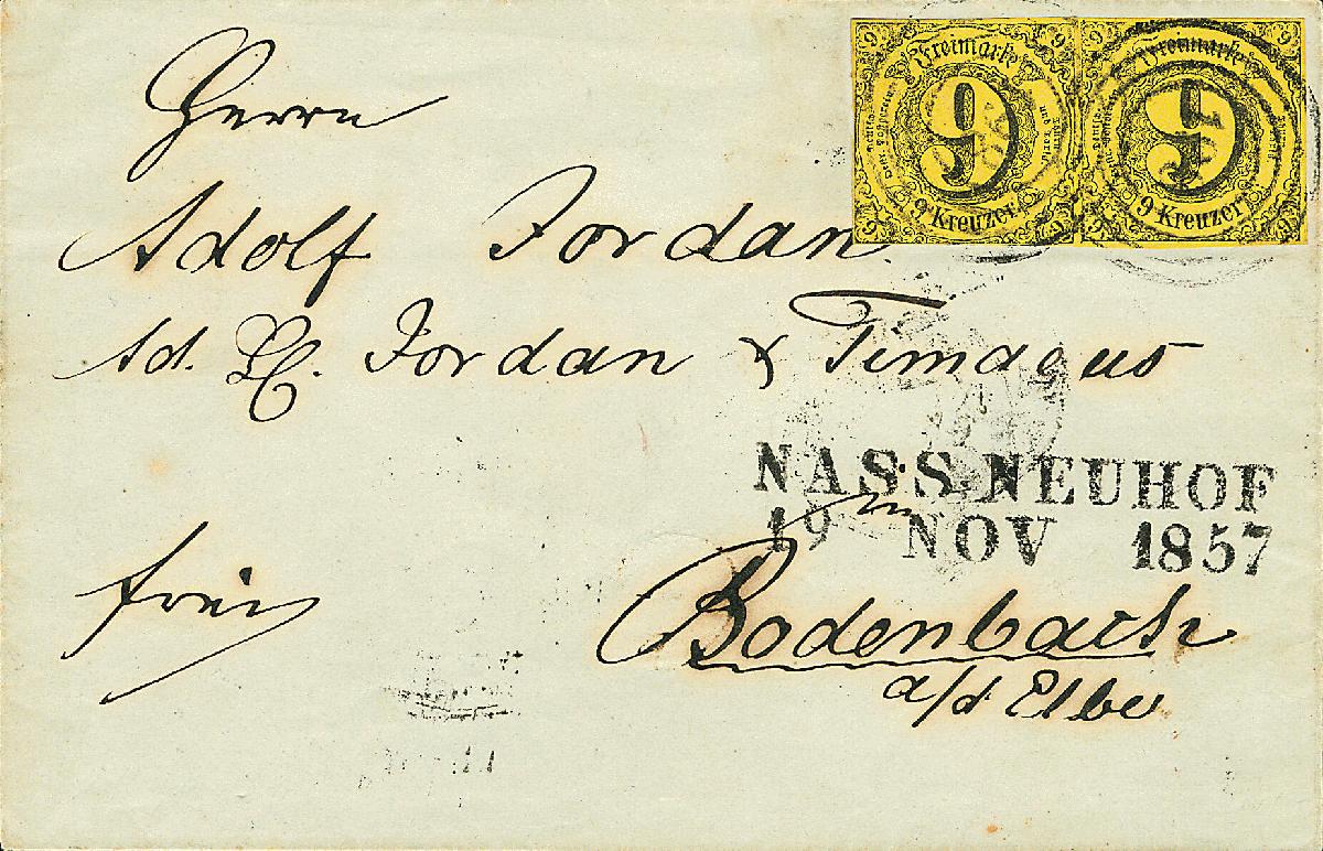 | Zusatzinformationen und Suchstichworte: | Dr. Derichs 170. Auktion 3. Juni 2023 Los 1574 Altdeutschland Thurn und Taxis "198" zweimal und Aufgabe-Zweizeiler "Nass. Neuhof 19 Nov.1857" auf Postvereinsbrief der zweiten Gewichtsstufe mit zwei voll- bis breitrandigen 9 Kr. schw./gelb (Type "II", linke Marke links unten durch Vortrennschnitt leicht berührt) nach Bodenbach an der Elbe in Böhmen, das damals zum Kaisertum Österreich und damit zum Postverein gehörte. Wahrscheinlich handelt es sich bei diesem Brief um den besten der wenigen bekannten Briefe mit dem Nummernstempel "198" von Neuhof. Neues Fotoattest Sem BPP: "Briefe mit dem Nummernstempel von Nass. Neuhof sind selten. Das Postamt wurde am 31.3.1859 aufgehoben.". (Handbuch = 1.800.-). Zuschlag 900,00 EUR |