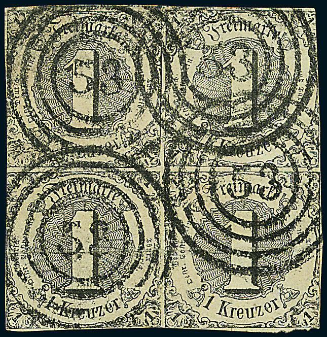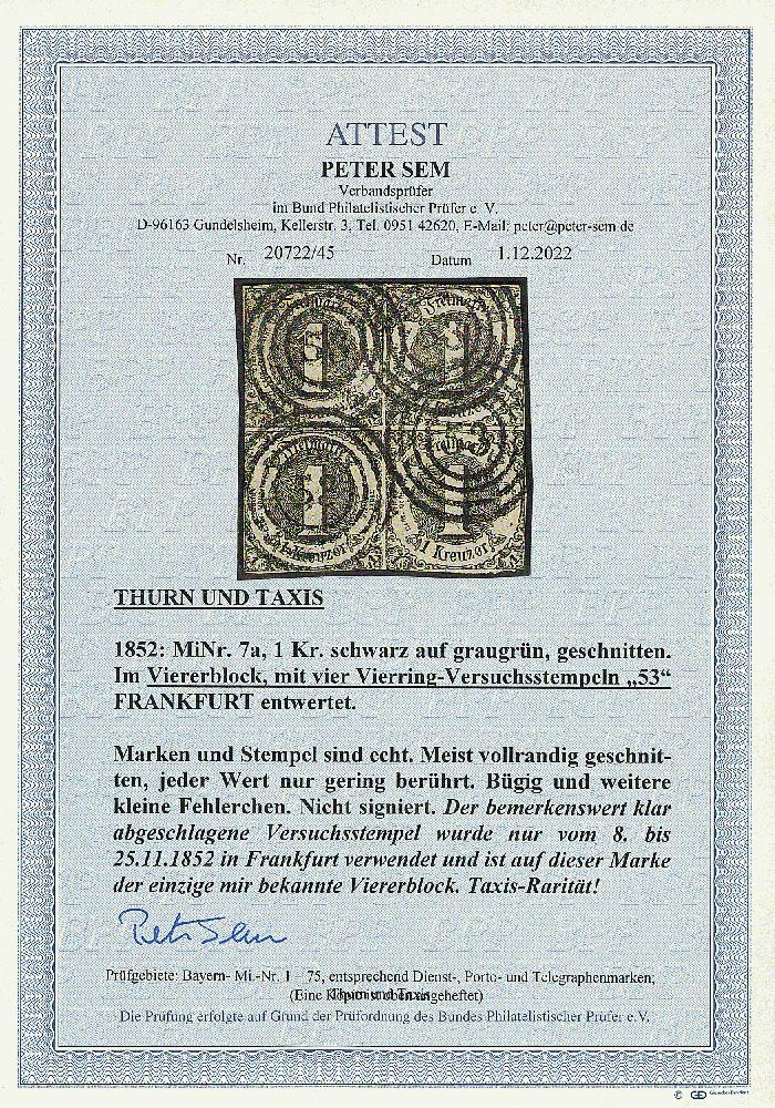 | Zusatzinformationen und Suchstichworte: | Dr. Derichs 170. Auktion 3. Juni 2023 Los 1575 Altdeutschland Thurn und Taxis "53" FRANKFURT/MAIN, sehr seltener Versuchsstempel viermal klar auf Viererblock 1 Kr. schw./graugrün, meist vollrandig geschnitten jeder Wert nur gering berührt, bügig und weitere kleine Fehlerchen. Gesamthaft ein dekoratives Blockstück. Diese große Stempelrarität verdient auf einem Viererblock das Prädikat "spektakulär". Fotoattest Dr. Sommer BPP und neues Fotoattest Sem BPP: "Der bemerkenswert klar abgeschlagene Versuchsstempel wurde nur vom 8. bis 25.11.1852 in Frankfurt verwendet und ist auf dieser Marke der einzige mir bekannte Viererblock. Taxis-Rarität!" (Michel 400.- und Handbuch für vier Stempelabschläge = 3.200.-) Zuschlag 420,00 EUR |