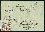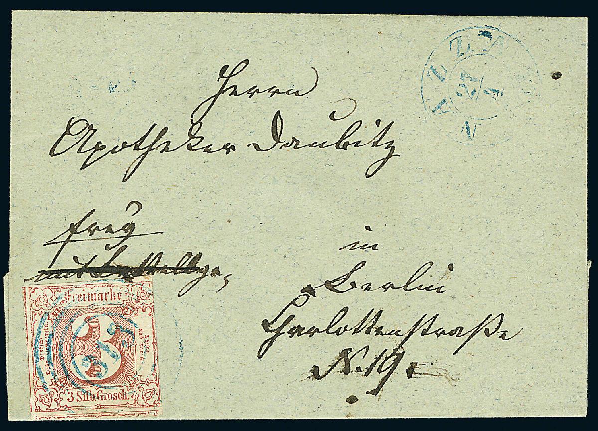 | Zusatzinformationen und Suchstichworte: | Dr. Derichs 170. Auktion 3. Juni 2023 Los 1583 Altdeutschland Thurn und Taxis "313" in BLAU und gleichfarbiger Aufgabe-K2 "Nazza 27/4" auf kleinem Brief mit 3 Sgr. braunrot, diese rechts leicht tangiert und sonst breit- bis überrandig mit Teilen von zwei Nachbarmarken, nach Berlin mit gestrichenem Vermerk "mit Bestellgeld", da in Berlin kein Bestellgeld erhoben wurde. Neuer Fotobefund Sem BPP. (Michel 240.- und Handbuch für die Abstempelung = 400.-, zusammen 640.-). Ausruf 100,00 EUR |