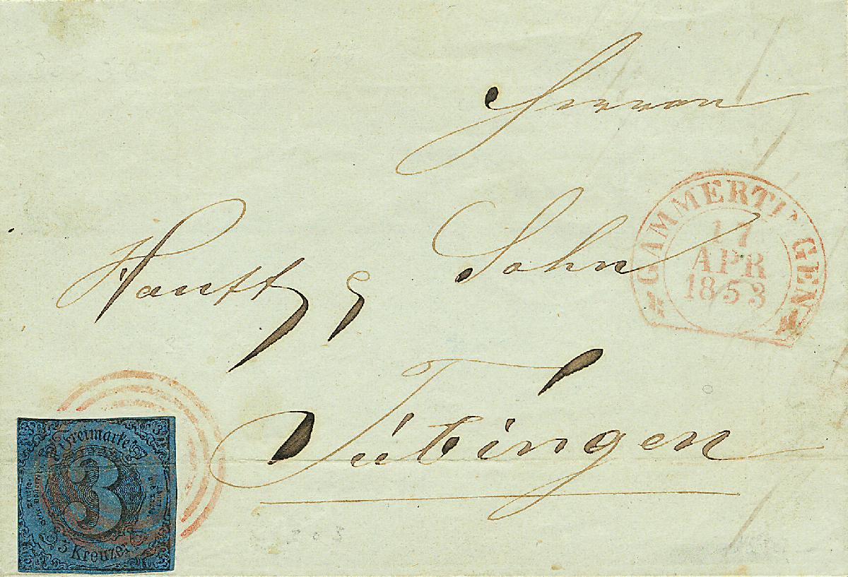 | Zusatzinformationen und Suchstichworte: | Dr. Derichs 170. Auktion 3. Juni 2023 Los 1588 Altdeutschland Thurn und Taxis "303 in ROT und ebenfalls roter Steigbügelstempel "Gammertingen 17 Apr.1853" auf Brief mit dreiseitig vollrandiger und nur oben leicht berührter 3 Kr. schw./blau (waagerechter Bug) nach Tübingen. Ein schöner Brief mit reizvollem Farbkontrast zwischen der dunkelblauen Marke und dem roten Stempel. Neuer Fotobefund Sem BPP: "Der rote '303' ist auf Brief selten.". (Handb. = 1.500.-). Zuschlag 1.800,00 EUR |
