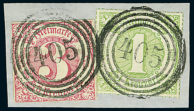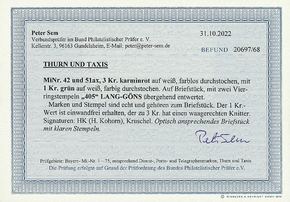 | Zusatzinformationen und Suchstichworte: | Dr. Derichs 170. Auktion 3. Juni 2023 Los 1604 Altdeutschland Thurn und Taxis "405" LANG-GÖNS, zwei ideal klare Abschläge auf Briefstück mit Mischfrankatur 3 Kr. karminrot "farblos durchstochen" (waagerechter Knitter) mit Luxusstück 1 Kr. grün "farbig durchstochen". Neuer Fotobefund Sem BPP: "Optische ansprechendes Briefstück mit klaren Stempeln.". (Handbuch für zwei Stempelabschläge = 360.-). Zuschlag 100,00 EUR |
