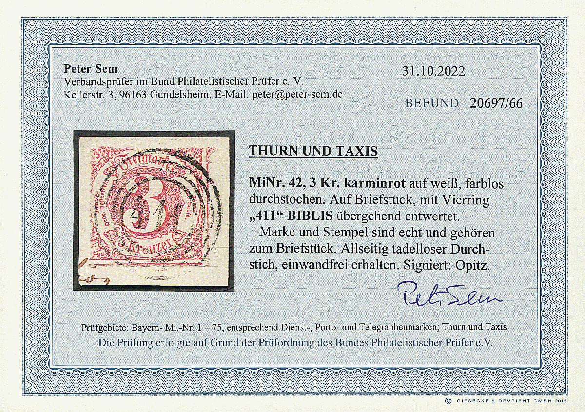 | Zusatzinformationen und Suchstichworte: | Dr. Derichs 170. Auktion 3. Juni 2023 Los 1609 Altdeutschland Thurn und Taxis "411" BIBLIS, klar und gerade auf Briefstück mit 3 Kr. karminrot "farblos durchstochen". Luxus. Neuer Fotobefund Sem BPP: "einwandfrei erhalten". (Handbuch = 250.-). Zuschlag 100,00 EUR |