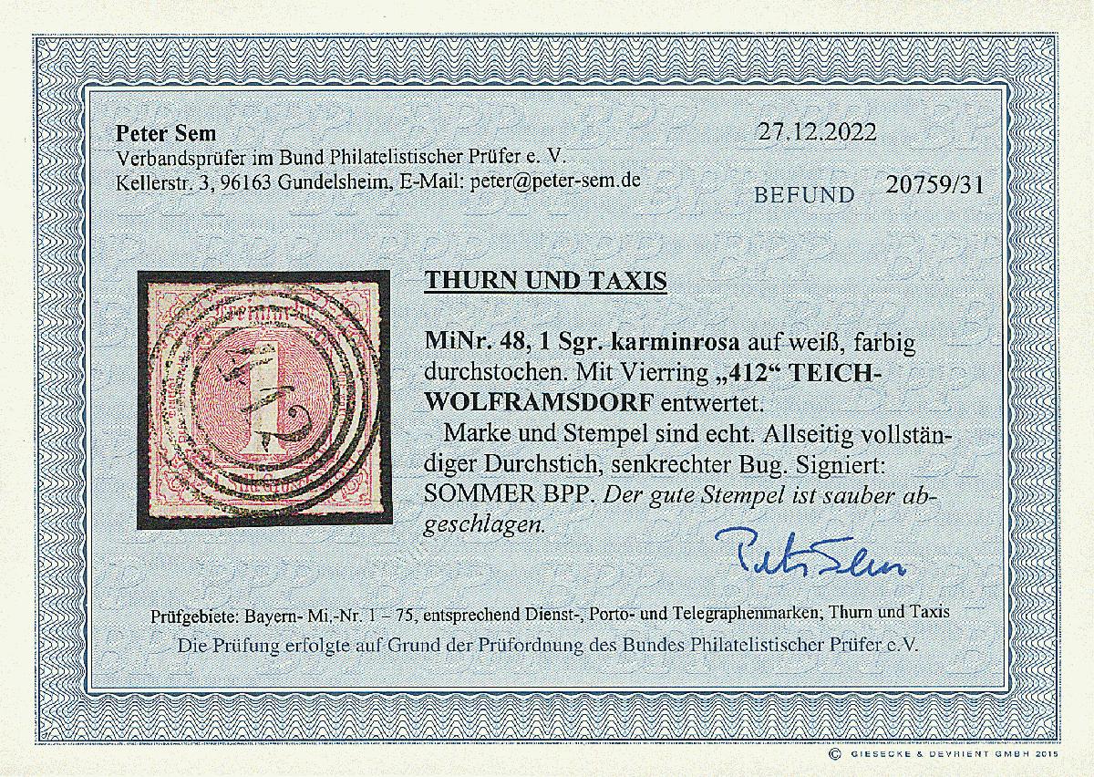 | Zusatzinformationen und Suchstichworte: | Dr. Derichs 170. Auktion 3. Juni 2023 Los 1611 Altdeutschland Thurn und Taxis "412" TEICHWOLFRAMSDORF, ganz ideal auf 1 Sgr. karminrosa "farbig durchstochen" (senkrechter Bug). Ein insbesondere in dieser Präzision seltener Stempel. Fotobefund Dr. Sommer BPP und neuer Fotobefund Sem BPP. (Handbuch = 500.-). Zuschlag 120,00 EUR |