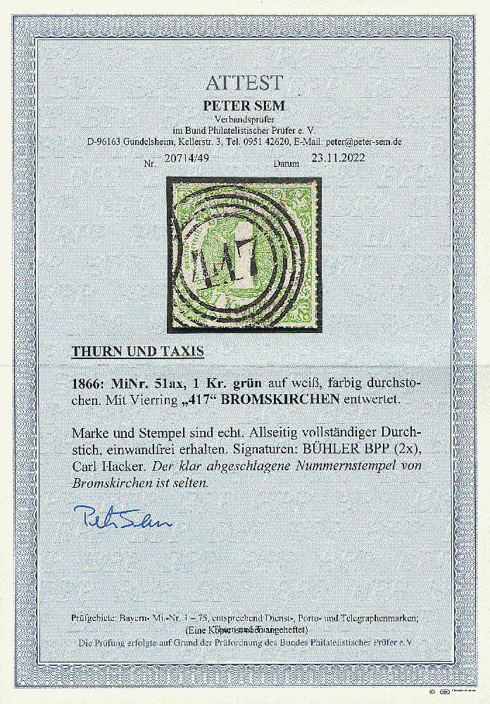 | Zusatzinformationen und Suchstichworte: | Dr. Derichs 170. Auktion 3. Juni 2023 Los 1616 Altdeutschland Thurn und Taxis "417" BROMSKIRCHEN, ideal klar auf 1 Kr. grün "farbig durchstochen". Luxus. Neues Fotoattest Sem BPP: "einwandfrei erhalten... Der klar abgeschlagene Nummernstempel von Bromskirchen ist selten.". (Handbuch = 1.000.-). Zuschlag 300,00 EUR |