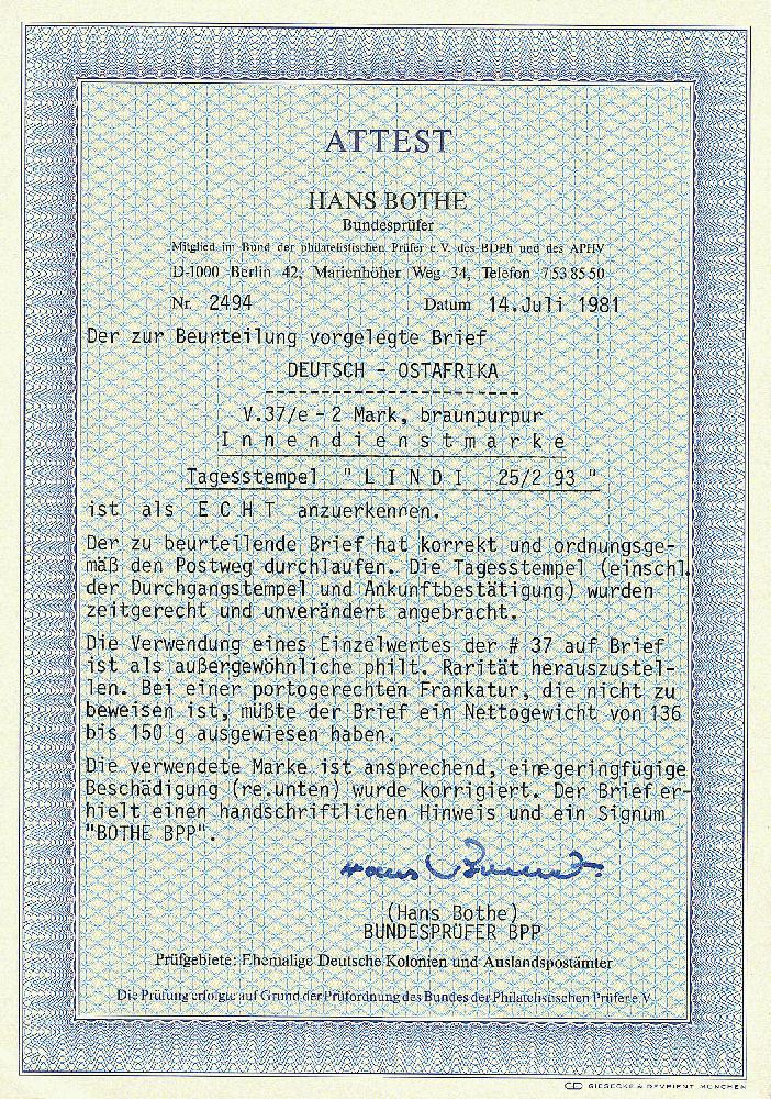 | Zusatzinformationen und Suchstichworte: | Dr. Derichs 170. Auktion 3. Juni 2023 Los 515 ● Deutsche Kolonien Ostafrika, Vorläufer \EINZELFRANKATUR DER 2-MARK-MARKE\: "Lindi 25/2 93", ideal klarer Abschlag auf in dem Gewicht von 136 bis 150 Gramm portogerechtem Brief mit Einzelfrankatur 2 Mark dunkelrotkarmin nach Breslau (rückseitig Ankunftstempel und Durchgangsstempel "Dar-Es-Salaam 27/2 93"). Winzige optisch nicht erkennbare Korrektur rechts unten. Schon auf Paketkarten stellt die "2 Mark" eine Seltenheit dar, auf Brief ist diese Wertstufe noch einmal um ein Vielfaches seltener. Eine Einzelfrankatur stellt eine der denkbar größten Raritäten auf dem Gebiet der Vorläuferausgaben dar. Fotoattest Bothe BPP. Ausruf 3.000,00 EUR |