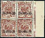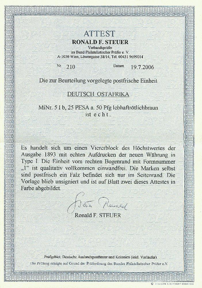 | Zusatzinformationen und Suchstichworte: | Dr. Derichs 170. Auktion 3. Juni 2023 Los 537 ● Deutsche Kolonien Ostafrika 25 Pesa auf 50 Pfg. lebhaftrötlichbraun, Aufdrucktype "I", Viererblock vom rechten Bogenrand (dort Formnummer "1"), drei Marken postfrisch und eine mit Falzrest. Mit der Formnummer sehr selten. Im Bogenrand geprüft Bothe BPP, die Marken selbst sind unsigniert, Fotoattest Bothe BPP und Fotoattest Steuer BPP. (Michel 600.-+, das ist der Preis für lose Marken ohne Aufschlag für die Formnummer.). Zuschlag 320,00 EUR |
