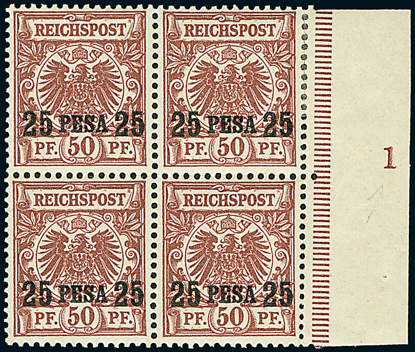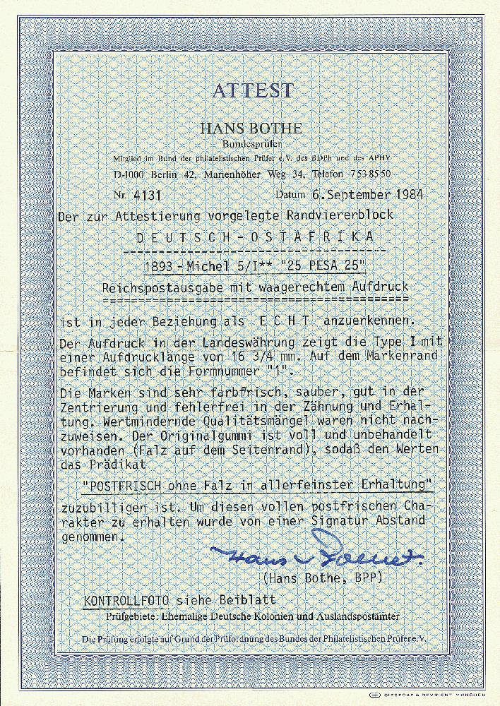 | Zusatzinformationen und Suchstichworte: | Dr. Derichs 170. Auktion 3. Juni 2023 Los 537 ● Deutsche Kolonien Ostafrika 25 Pesa auf 50 Pfg. lebhaftrötlichbraun, Aufdrucktype "I", Viererblock vom rechten Bogenrand (dort Formnummer "1"), drei Marken postfrisch und eine mit Falzrest. Mit der Formnummer sehr selten. Im Bogenrand geprüft Bothe BPP, die Marken selbst sind unsigniert, Fotoattest Bothe BPP und Fotoattest Steuer BPP. (Michel 600.-+, das ist der Preis für lose Marken ohne Aufschlag für die Formnummer.). Zuschlag 320,00 EUR |