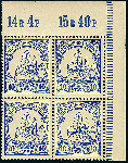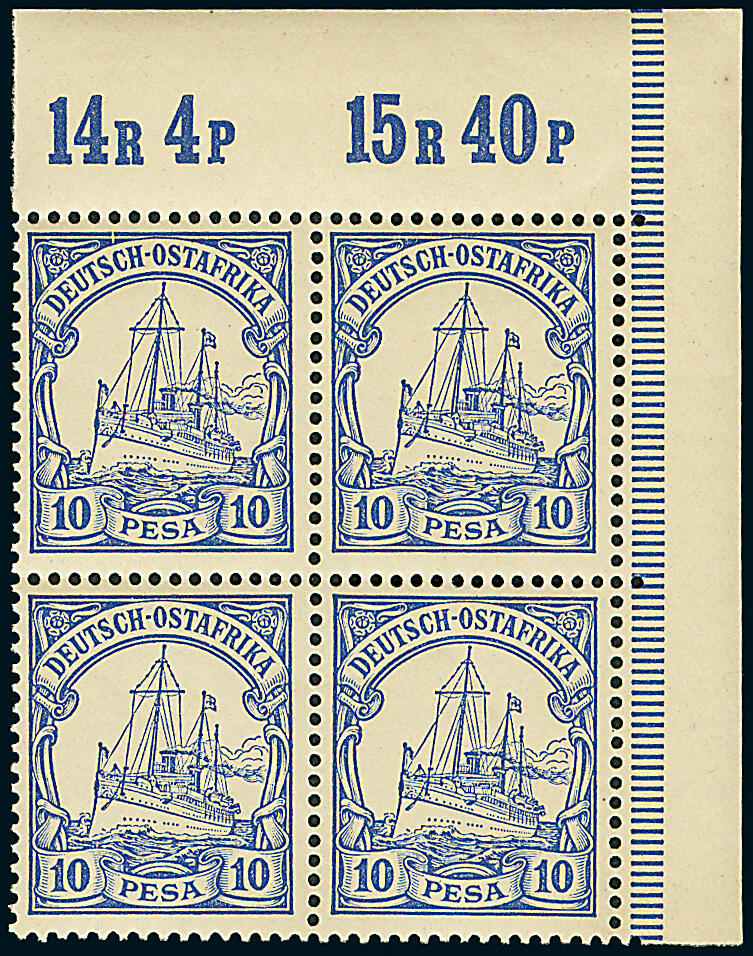 | Zusatzinformationen und Suchstichworte: | Dr. Derichs 170. Auktion 3. Juni 2023 Los 554 Deutsche Kolonien Ostafrika 10 Pesa "Kaiseryacht", Viererblock aus der rechten oberen Bogenecke in postfrischer Luxus-Qualität. Die linke obere Marke zeigt den Plattenfehler "Bruch im Oberrand über C in DEUTSCH" (Bogenfeld 9). Unsigniert, Fotoattest Jäschke-Lantelme BPP: "in fehlerfreier, postfrischer Erhaltung". (Michel 1.380.-+, das ist der Preis für lose Marken ohne Aufschlag für die Einheit und die Bogenecke.). Zuschlag 280,00 EUR |