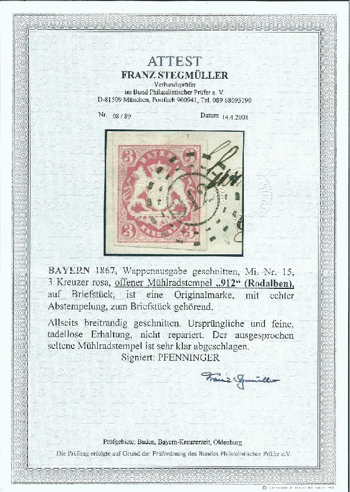 | Zusatzinformationen und Suchstichworte: | Rauhut & Kruschel - 218. Auktion 10. Juni 2023 Los 349 Altdeutschland Bayern "912", vollständiger, klarer Abschlag des sehr seltenen Pfalz-oMR von Rodalben auf Kabinettbriefstück 3 Kr. rosa. Sign. Pfenninger und Attest Stegmüller. Feuser + 4000,- Ausruf 2.200,00 EUR |