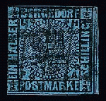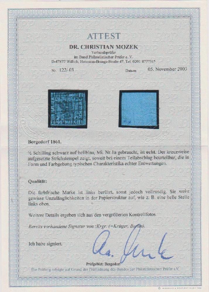 | Zusatzinformationen und Suchstichworte: | Rauhut & Kruschel - 218. Auktion 10. Juni 2023 Los 357 Altdeutschland Bergedorf 1/2 Sch. schw./hellblau, sauber kreuzweise gestempelt mit qualitativen Einschränkungen (links berührt, randhell). Sign. Krüger und Attest Dr. Mozek. Mi. 1300,- (Feld 6 des Umdruckblocks) |