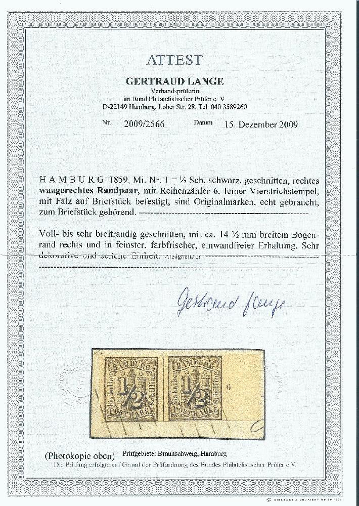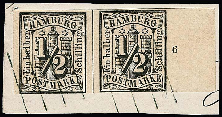 | Zusatzinformationen und Suchstichworte: | Rauhut & Kruschel - 218. Auktion 10. Juni 2023 Los 438 Altdeutschland Hamburg 1/2 Sch. schwarz im Paar mit rechts 14 1/2mm breitem Bogenrand, Reihenzahl "6", allseits voll- bis breitrandig, auf Kabinettbriefstück mit feinem Strichstempel. Mit derart breitem Bogenrand ein sehr seltenes Paar Ausruf 2.200,00 EUR |