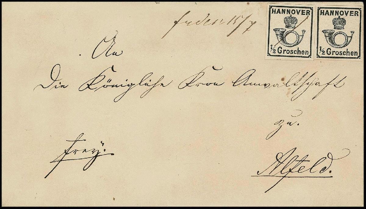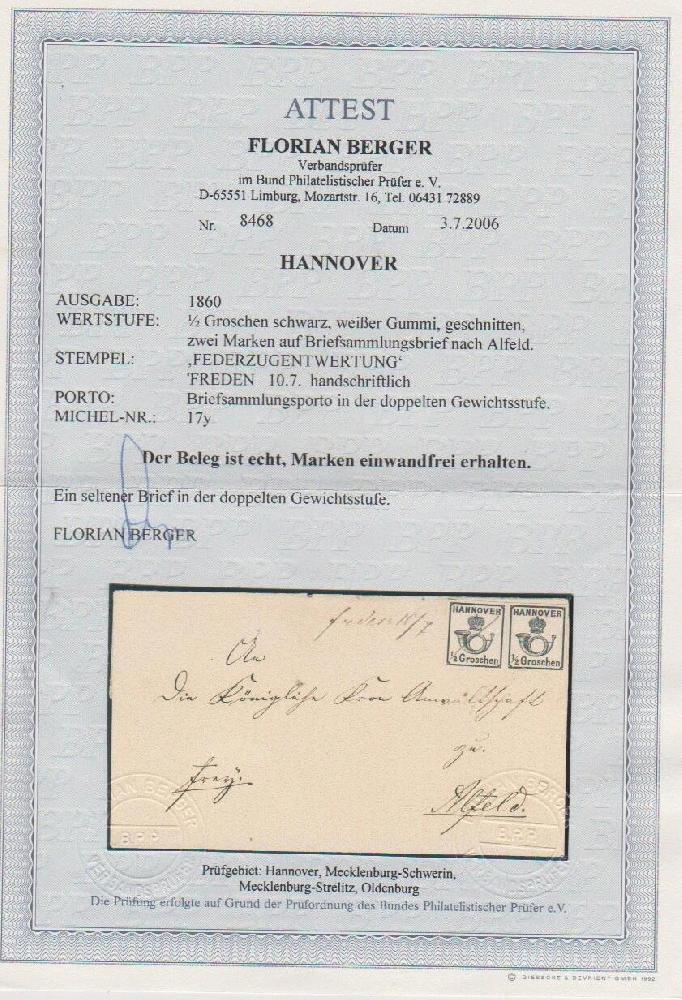 | Zusatzinformationen und Suchstichworte: | Rauhut & Kruschel - 218. Auktion 10. Juni 2023 Los 564 Altdeutschland Hannover 1/2 Gr. schwarz, zwei Kabinettstücke auf Briefsammlungsbrief mit handschriftlicher Entwertung "Freden" nach Alfeld, seltener Brief der doppelten Gewichtsstufe Zuschlag 950,00 EUR |