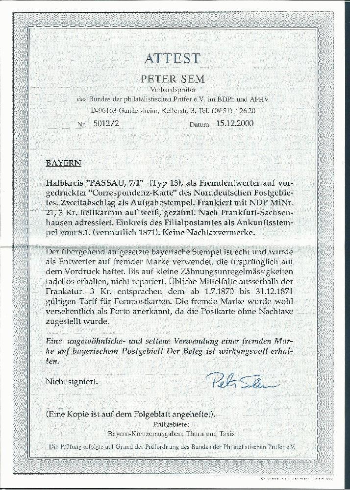 | Prüfgebiet: | Norddeutscher Postbezirk 1868 - 1871 |