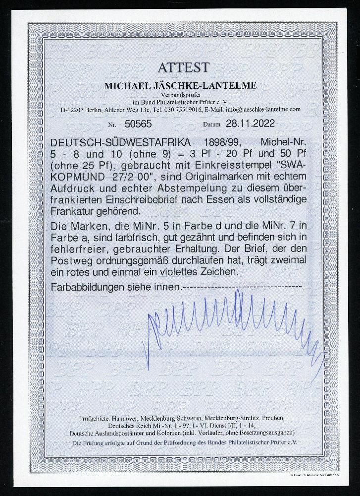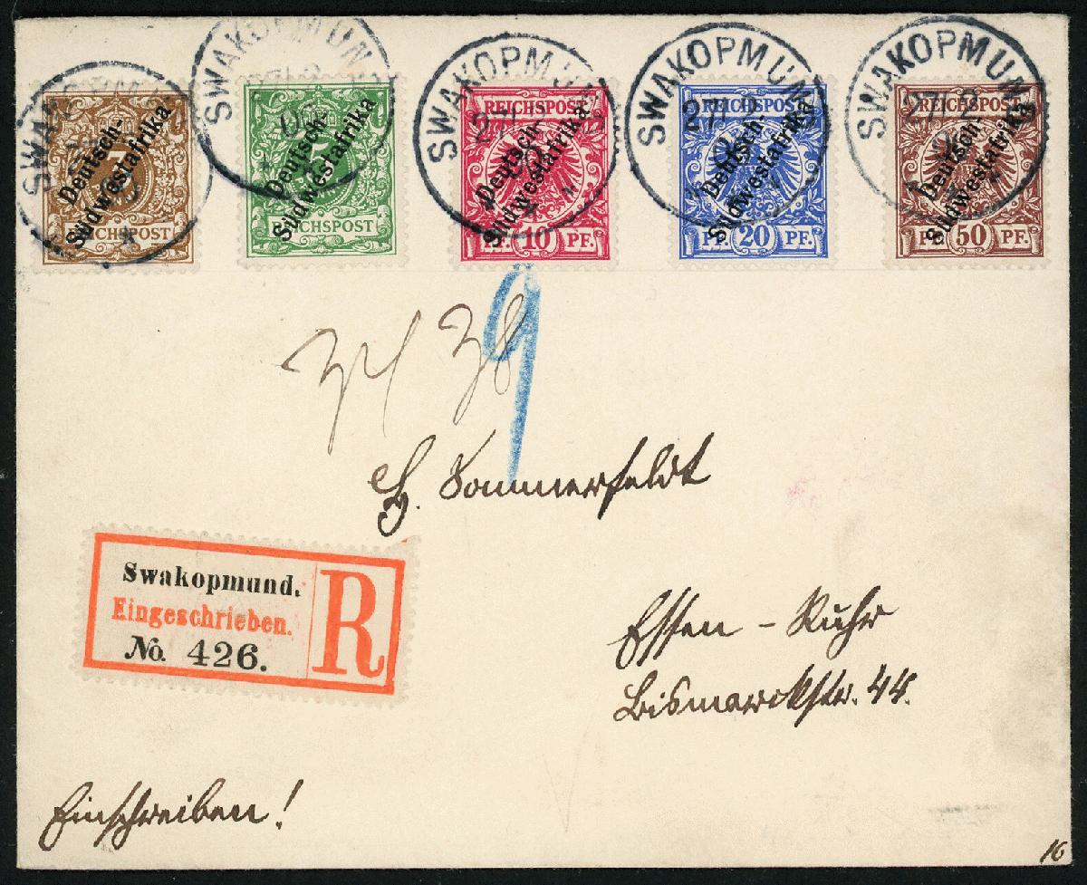 | Zusatzinformationen und Suchstichworte: | Klüttermann - 6. Auktion 27. Juli - 4. August 2023 Los 5583 Deutsche Kolonien Südwestafrika 3 Pfg. lebhaftorangebraun mit 5,10,20 und 50 Pfg. auf Luxus-R-Brief SWAKOPMUND 27/2 00 nach Essen, die 3 Pfg. in dieser Farbe ist extrem selten und auf Brief kaum bekannt, deshalb im Michel auch nicht bewertet, Liebhaberstück mit FA Jäschke-L. (202w) Ausruf 1.000,00 EUR |