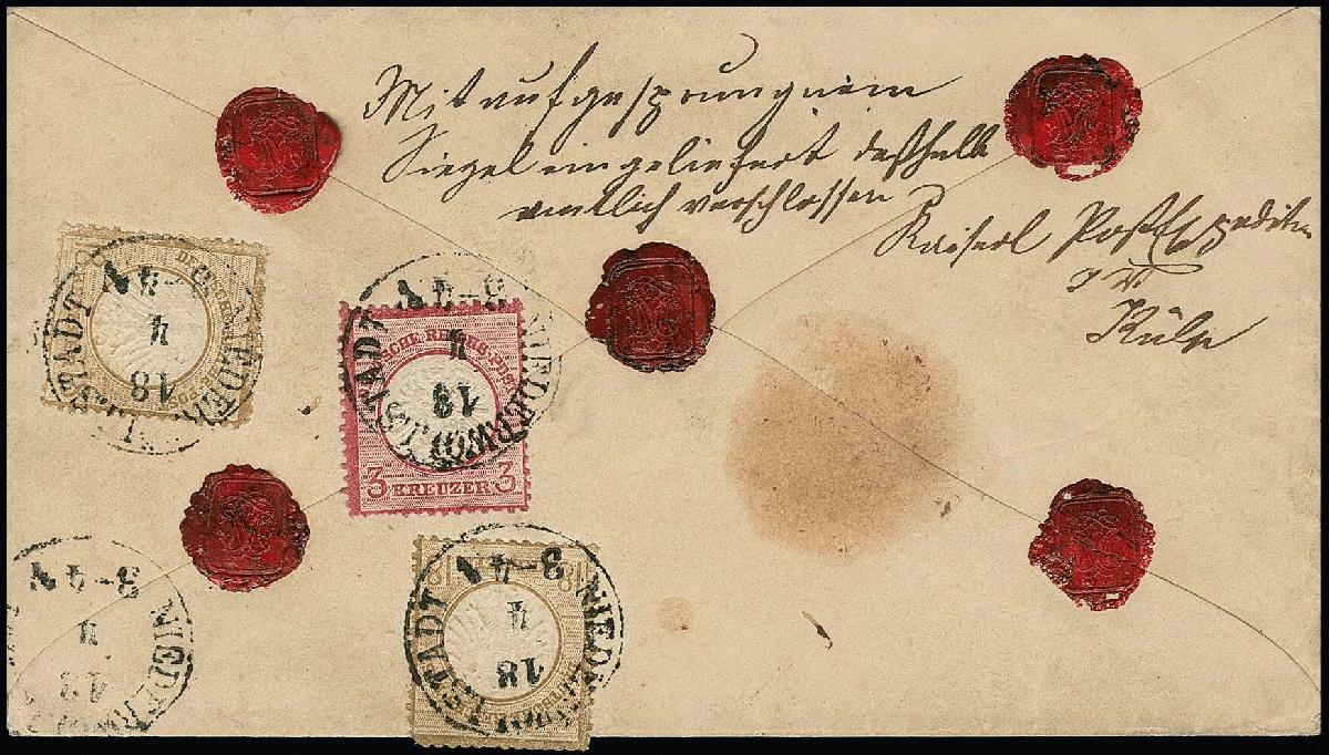| Zusatzinformationen und Suchstichworte: | Rauhut & Kruschel - 218. Auktion 10. Juni 2023 Los 1768 Deutsches Reich, 1872 Grosser Brustschild 18 Kr. ockerbraun, zwei ausgabetypisch gezähnte Exemplare, dabei eines kleine Mängel durch Randklebung, nebst 3 Kr. karmin, rs. auf Wertbrief mit altem Taxis-K1 "Niederwöllstadt" nach Wien. Attest Sommer "seltener Beleg in guter Erhaltung". Mi. 2900,- Zuschlag 450,00 EUR |