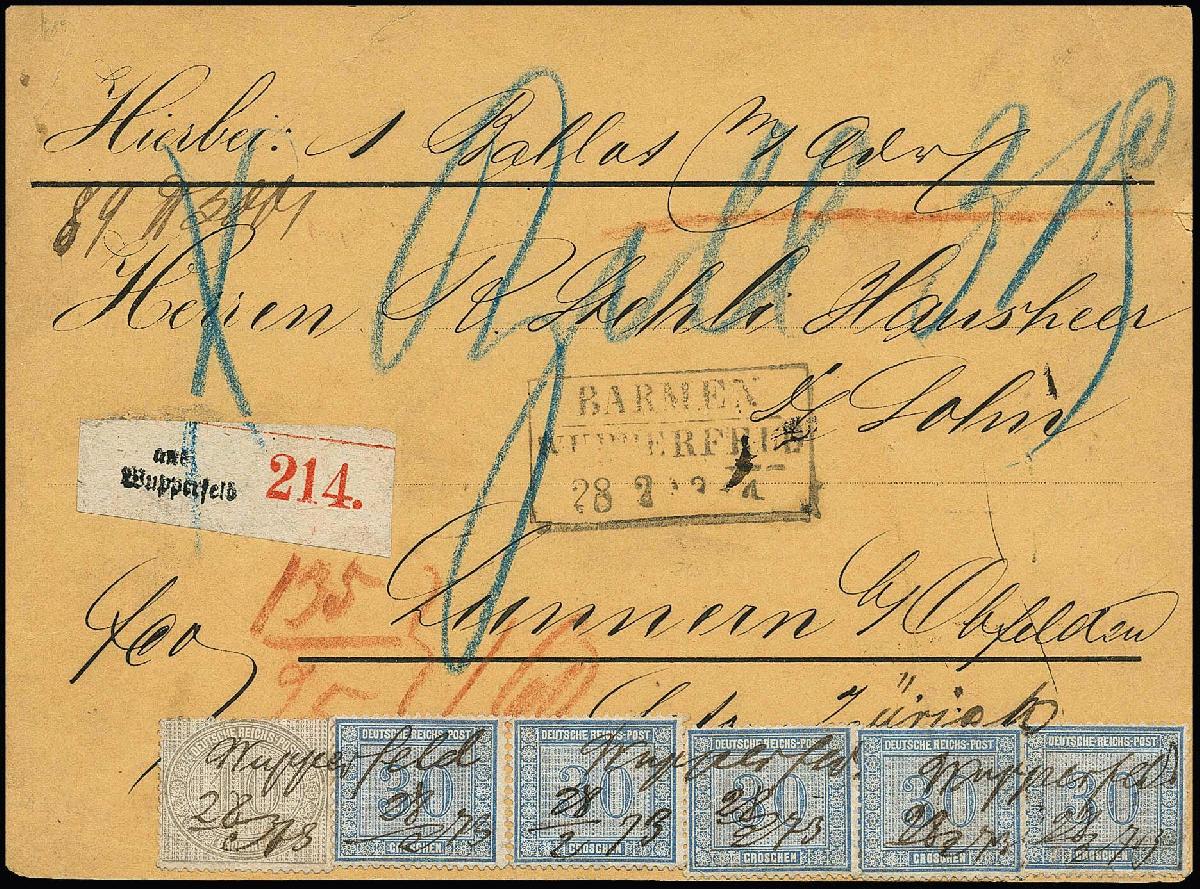 | Zusatzinformationen und Suchstichworte: | Rauhut & Kruschel - 218. Auktion 10. Juni 2023 Los 1778 Deutsches Reich, 1872 Kleiner Brustschild 30 Gr. blau per fünf, nebst 10 Gr. grau, auf privat vorgedruckter (!) Paketbegleitkarte von Barmen-Wupperfeld 1873 nach Lunnern/Schweiz. Seltene 160-Gr.-Frankatur nur mit Innendienst-Werten (im Randbereich unten etwas ausgebessert) Ausruf 1.800,00 EUR |
