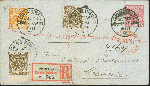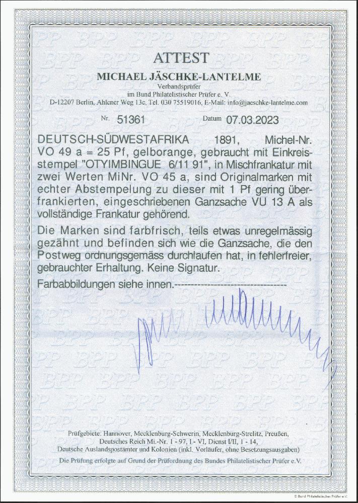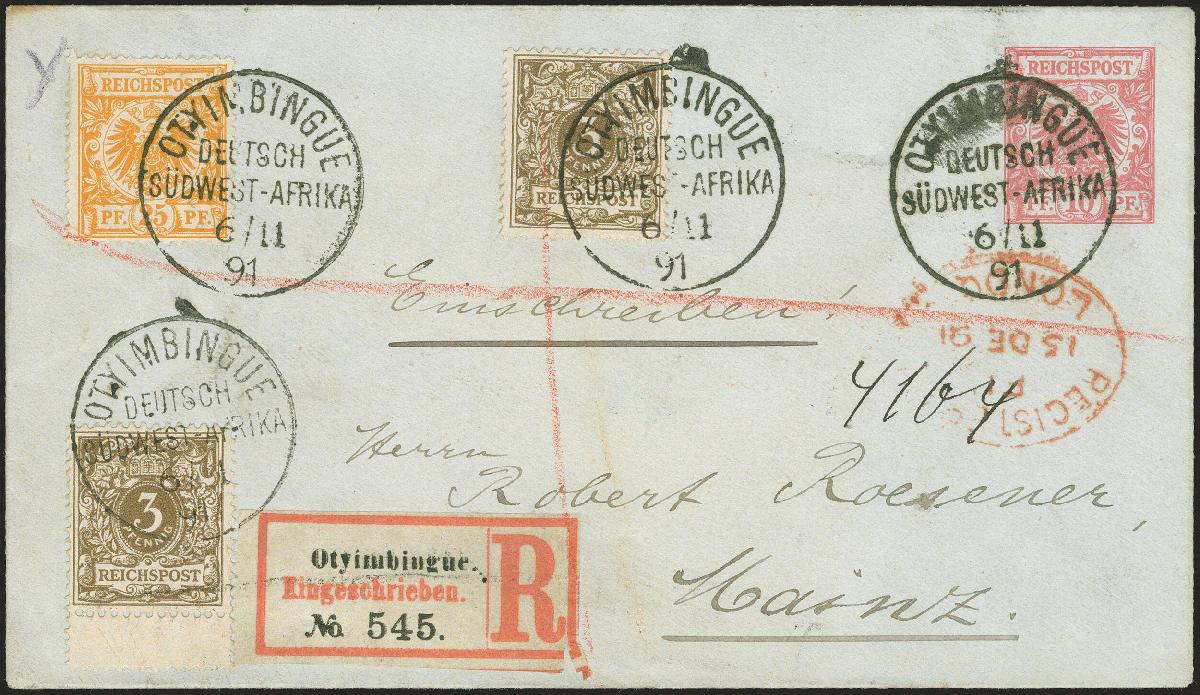 | Zusatzinformationen und Suchstichworte: | Heinrich Köhler - IBRA Sonderauktion - Erivan: Deutschland ab 1872 27. Mai 2023 Los 90 Deutsche Kolonien Südwestafrika 25 Pfennig gelborange und zwei Einzelwerte 3 Pfennig gelblichbraun, alle farbfrisch, teils etwas unregelmäßig gezähnt, als Zufrankatur auf Ganzsachenumschlag 10 Pfennig, mit jeweils sauber aufgesetztem Stempel "OTYIMBINGUE 6/11 91", als R-Brief nach Mainz (1 Pfg. überfrankiert) mit vorderseitigem roten "REGISTERED LONDON" und rückseitigem Ausgabestempel. Tadellos. Fotoattest Jäschke-L. BPP (2023) Zuschlag 750,00 EUR |