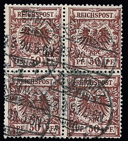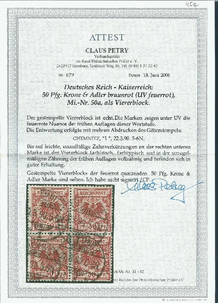 | Zusatzinformationen und Suchstichworte: | Rauhut & Kruschel - 218. Auktion 10. Juni 2023 Los 1952 Deutsches Reich, 1889 Krone/Adler 50 Pfg. braunrot, UV "feuerrot", von der frühen Auflage seltener gestempelter Viererblock ("Chemnitz, 22.3.90"). Rechte untere Marke leichte Zahnverkürzungen (siehe Foto), sonst gute Gesamterhaltung Ausruf 180,00 EUR |
