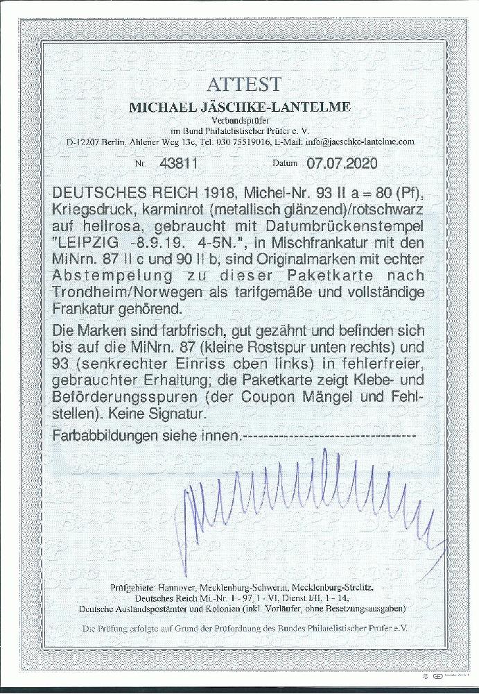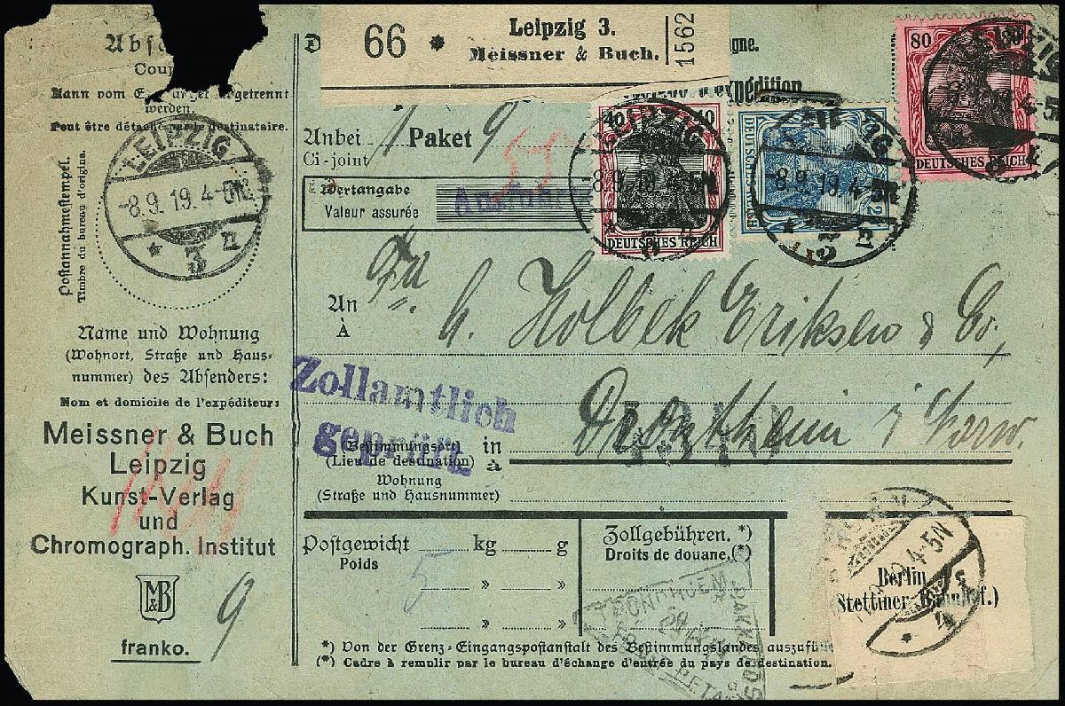 | Zusatzinformationen und Suchstichworte: | Rauhut & Kruschel - 218. Auktion 10. Juni 2023 Los 1997 Deutsches Reich, Germania mit WZ 80 Pfg. "metallisch glänzend", unauffälliger Einriß, nebst 20 u. 40 Pfg., auf Auslands-Paketkarte von Leipzig 1919 nach Norwegen, Coupon der Paketkarte Fehlstellen Ausruf 150,00 EUR |