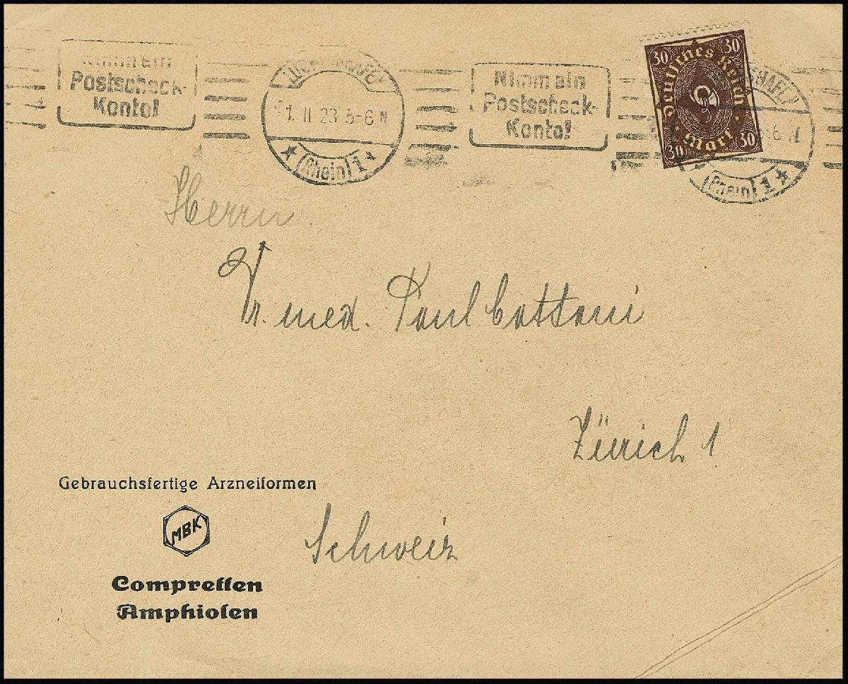| Zusatzinformationen und Suchstichworte: | Rauhut & Kruschel - 218. Auktion 10. Juni 2023 Los 2057 Deutsches Reich, 1918/23 Inflationsausgaben 30 Mk., Walzendruck-Rollenmarke in typischer Rollenzähnung als seltene portogerechte Einzelfrankatur auf Auslands-Drucksache von Ludwigshafen, 1.2.23, nach Zürich Ausruf 100,00 EUR |