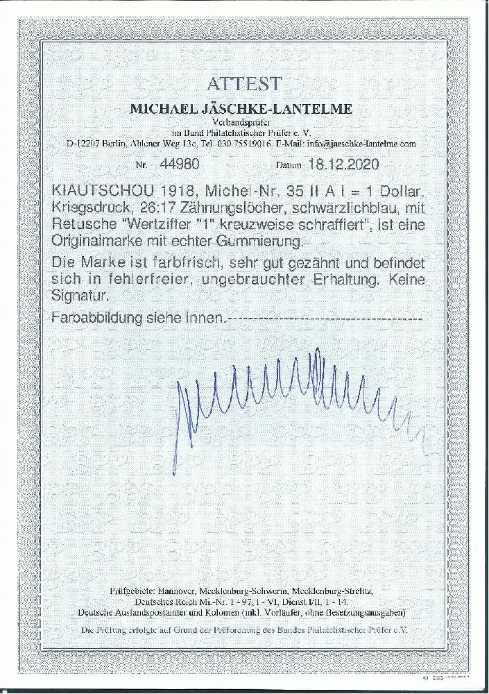 | Prüfer: | Jäschke-Lantelme, Michael (BPP (Bund Philatelistischer Prüfer)) |