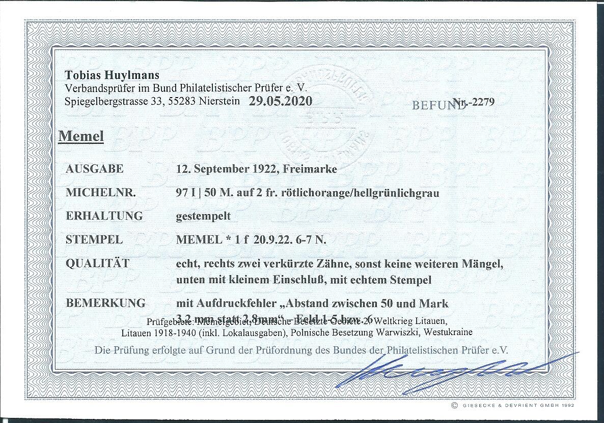 | Prüfer: | Huylmans, Tobias (BPP (Bund Philatelistischer Prüfer)) |